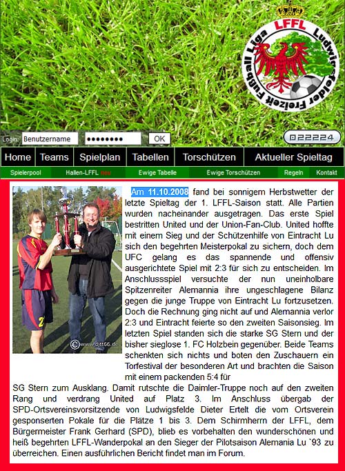 Alle Ergebnisse von den durchgeführten Spielen der Ludwigsfelder Freizeit Fussball Liga findet ihr hier. Leider sind keine Spielberichte oder Fotos von den einzelnen Spielen vorhanden oder vorgesehen. Aber zumindest von unseren Spielen bekommt Ihr alles auf unserer Website.